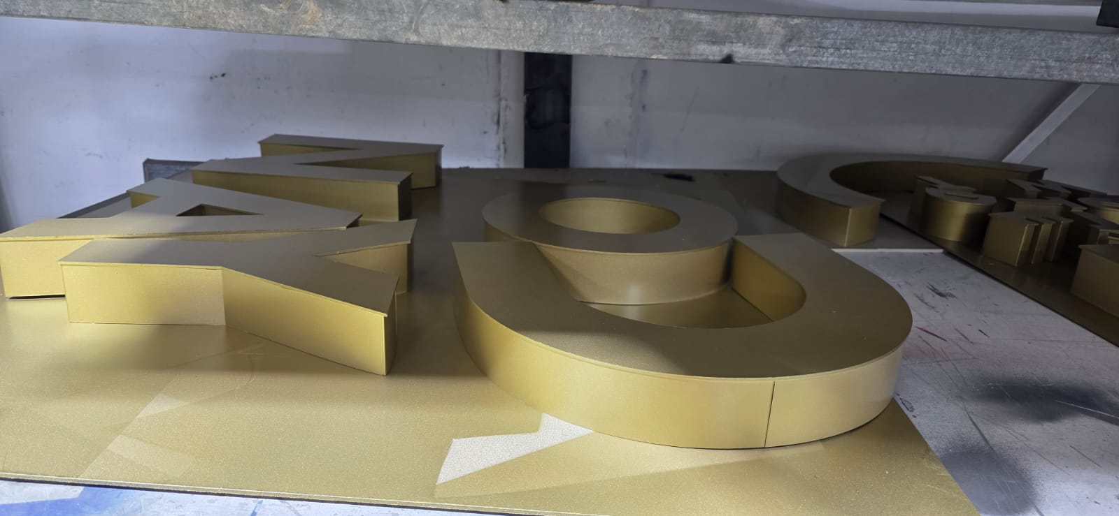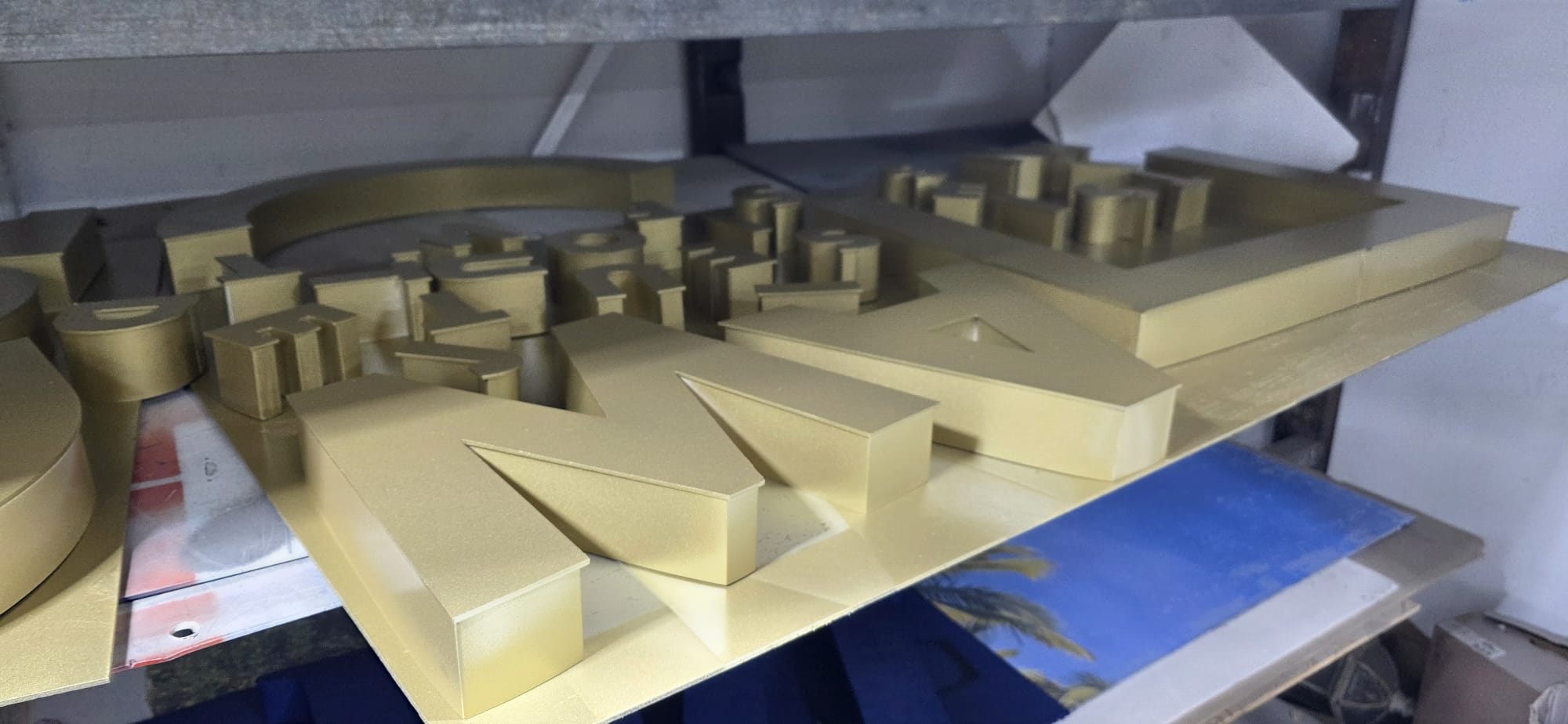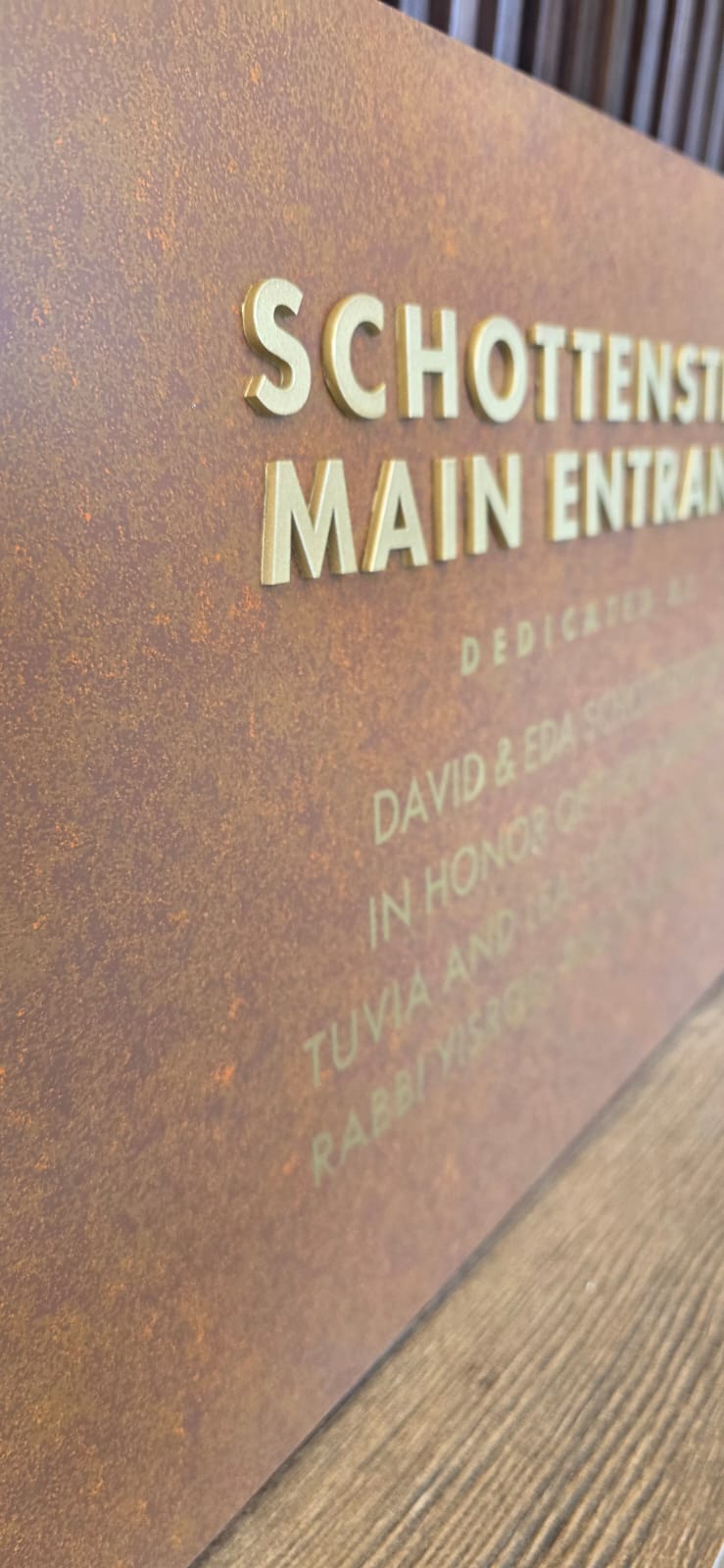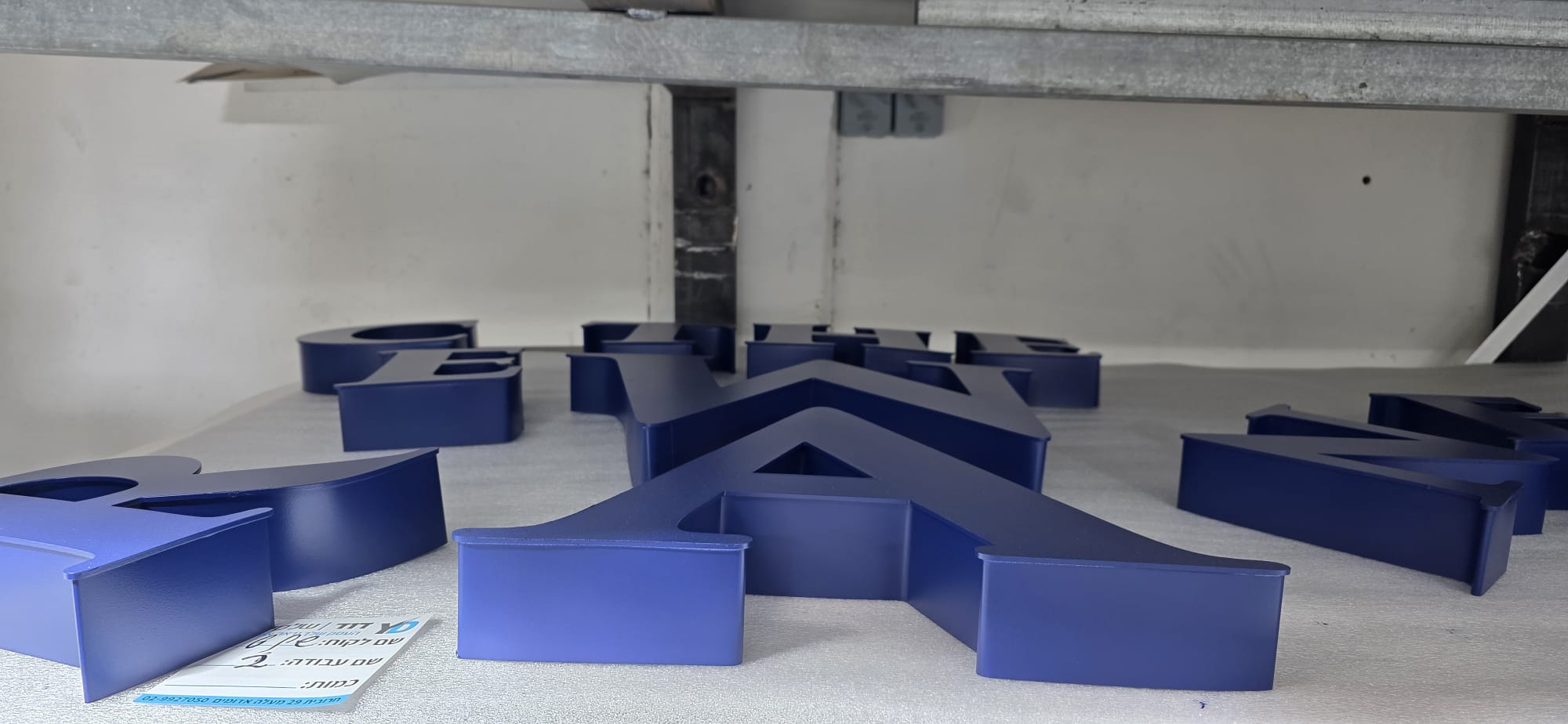 ביצענו שלט אלומיניום בצביעה ידנית דו גוונים דמוי חלוקה. חרטנו בCNC והזרקנו צבע זהב בתוך האותיות.