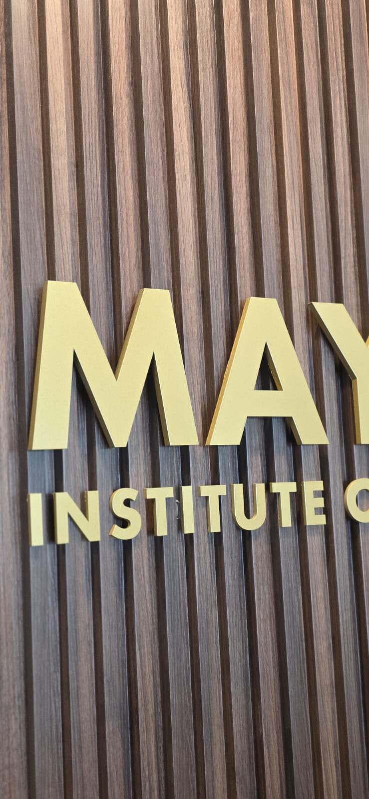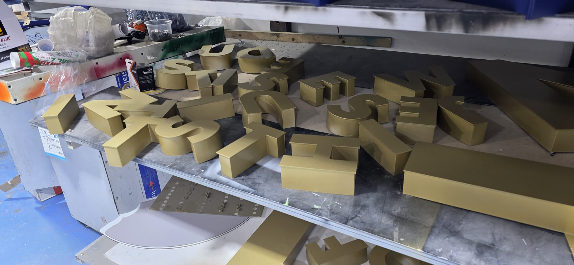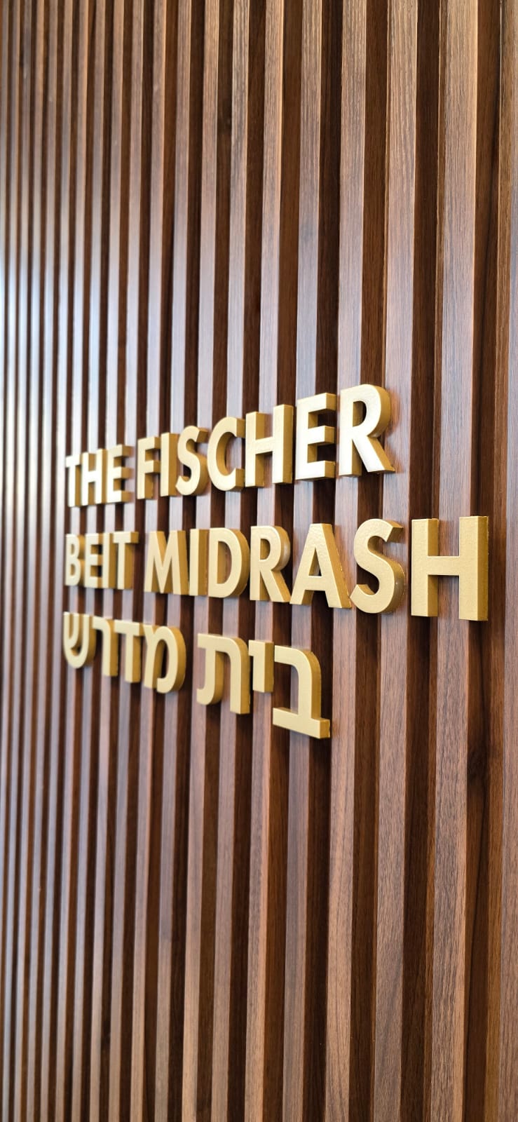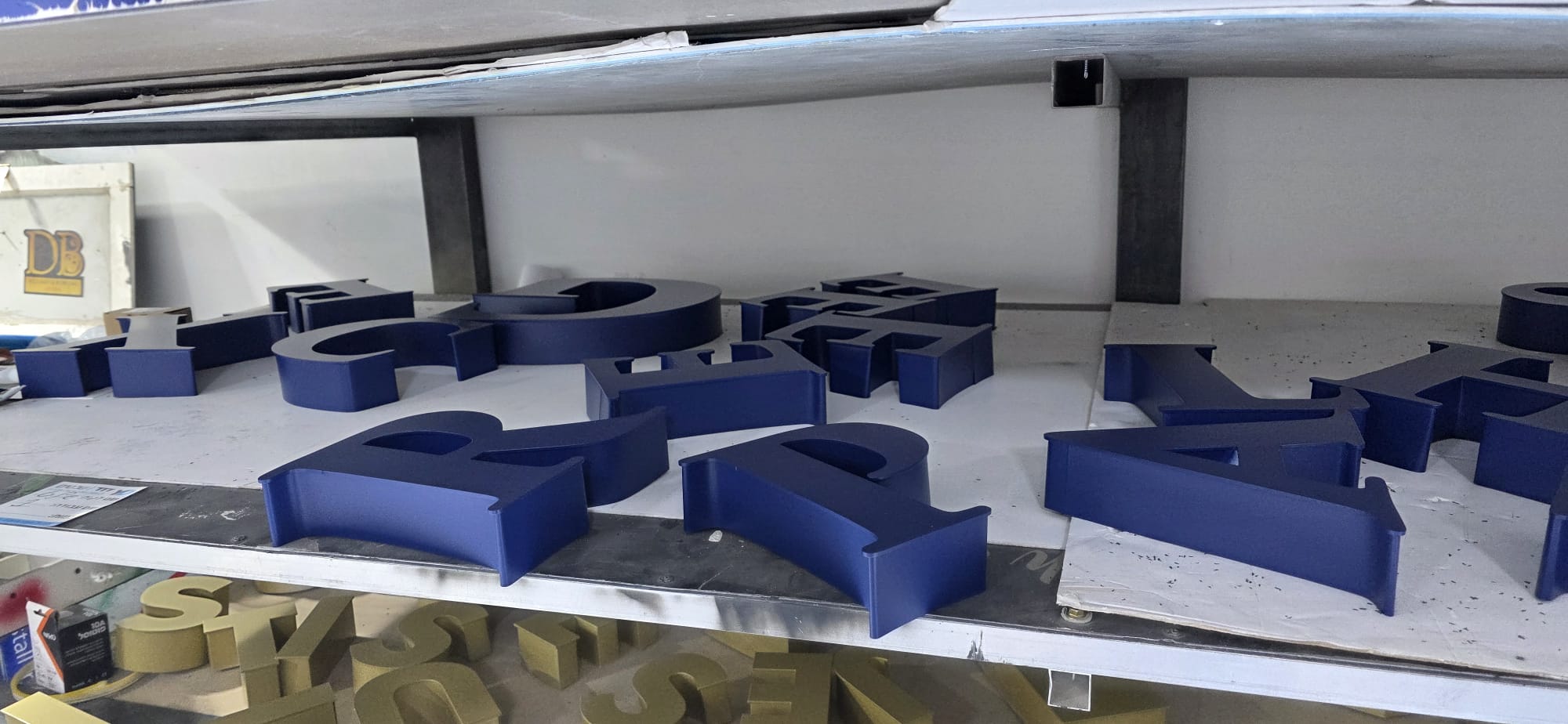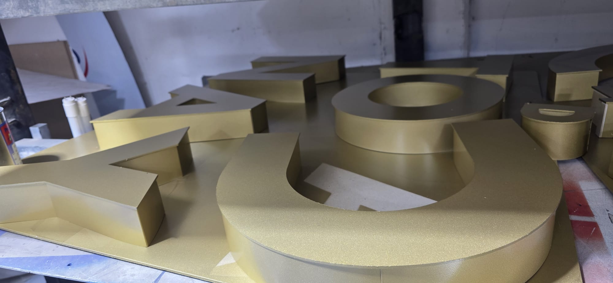 ביצענו שלט אלומיניום בצביעה ידנית דו גוונים דמוי חלוקה. חרטנו בCNC והזרקנו צבע זהב בתוך האותיות.