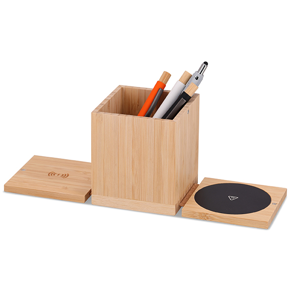 מטען אלחוטי 15W מתקפל במבוק משולב עם פלטה לחימום קפה וכוס לעטים דגם 5395