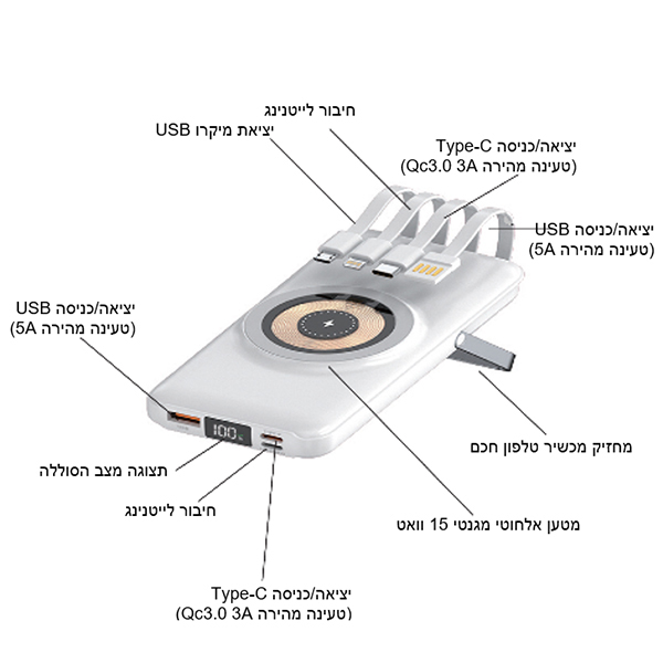 סוללת גיבוי 10,000mAh עם מטען אלחוטי
