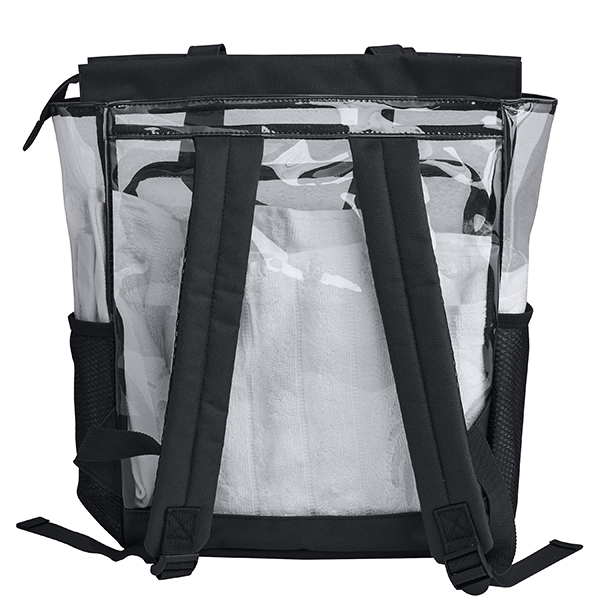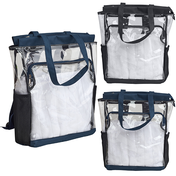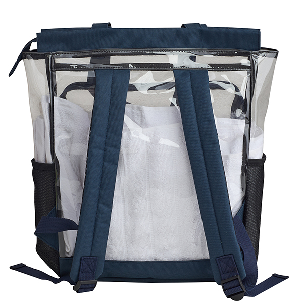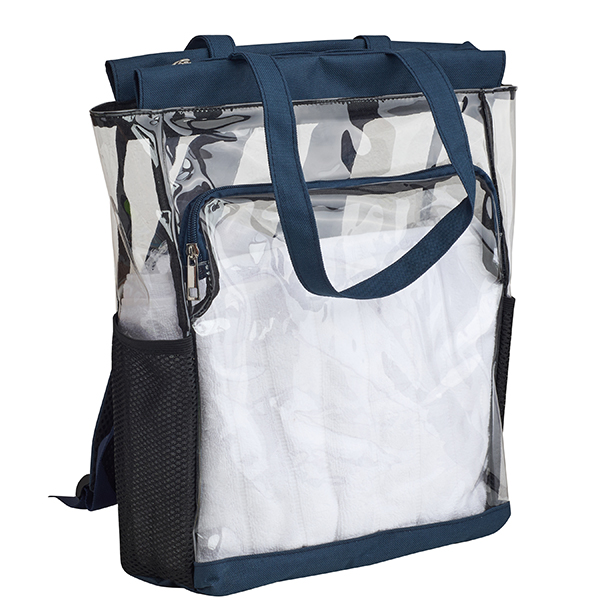 תיק גב שקוף עם תא קדמי בעיצוב תיפור כחול.