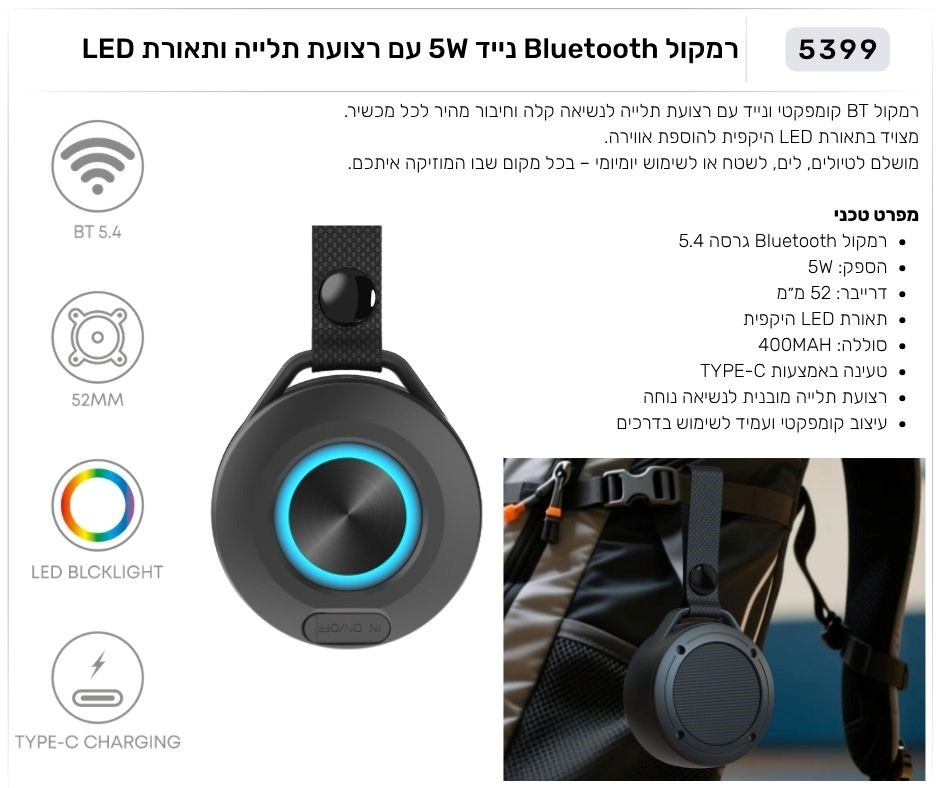 רמקול Bluetooth נייד 5W עם רצועת תלייה ותאורת LED דגם 5399